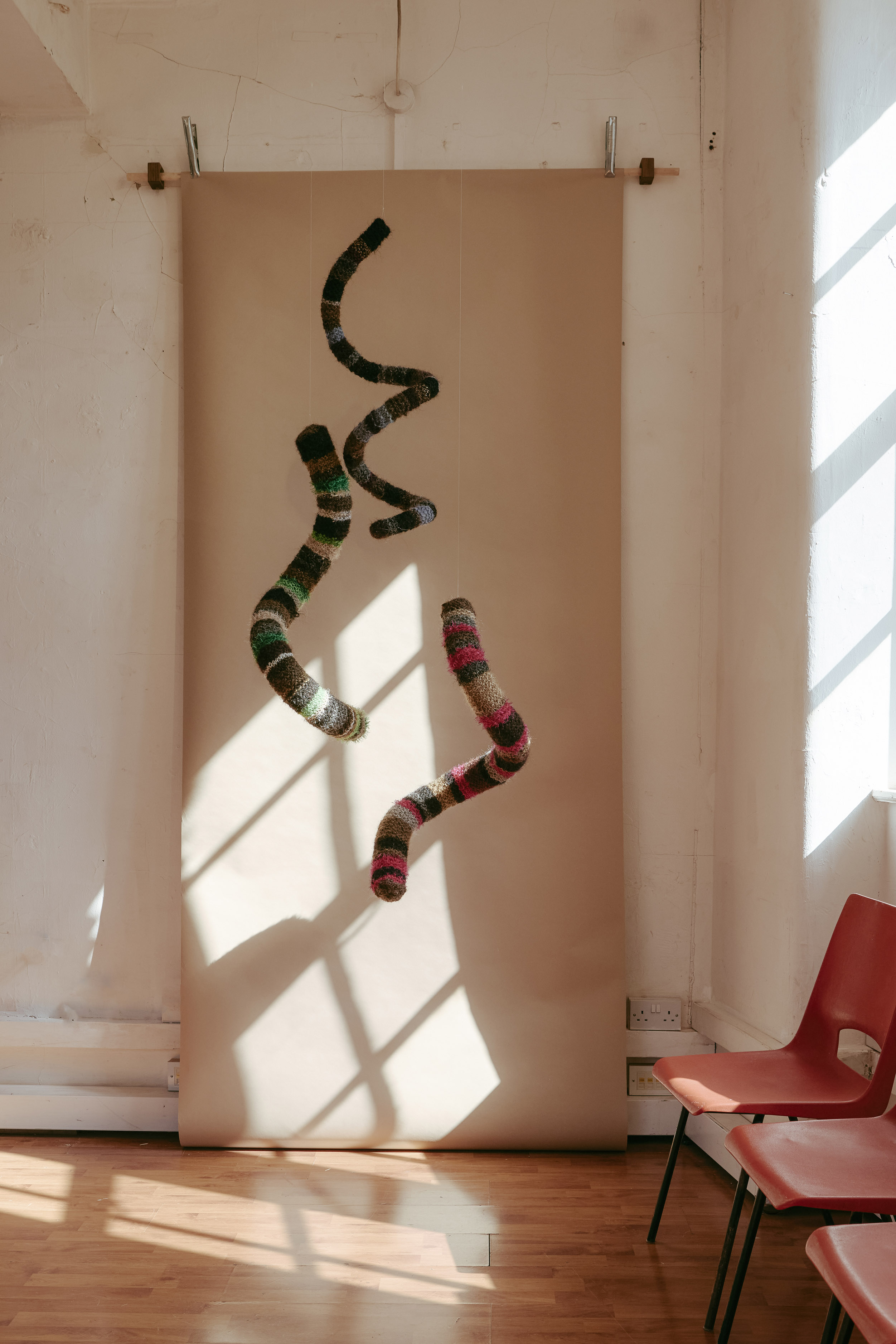Channelling her experience of using synthetic hair in her braids, Mia Rodney has seized the opportunity to create an in-house version of the HairCycle process. Using knitting and crochet techniques to divert personal beauty waste from landfills into materials for her creative practice. Building on her previous work, the curly shapes represent her personal journey of self-acceptance and act as symbols of resilience and beauty.